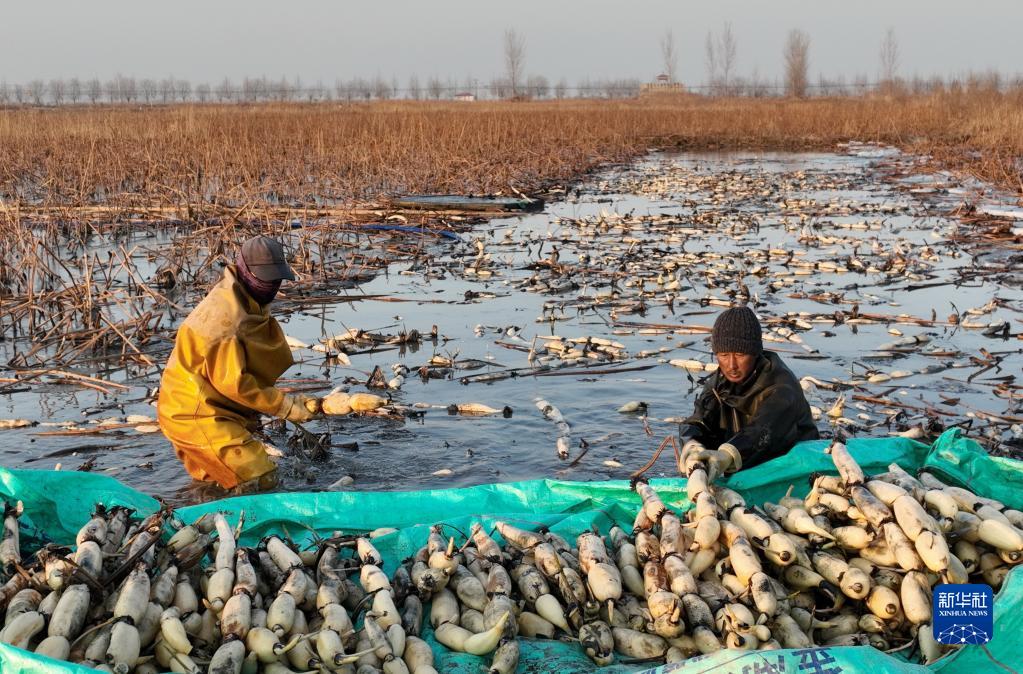 寒冬時(shí)節,在河北省邢臺市新河縣新河鎮白穴口村蓮藕種植基地,農民們忙著(zhù)采挖蓮藕供應兩節市場(chǎng)。