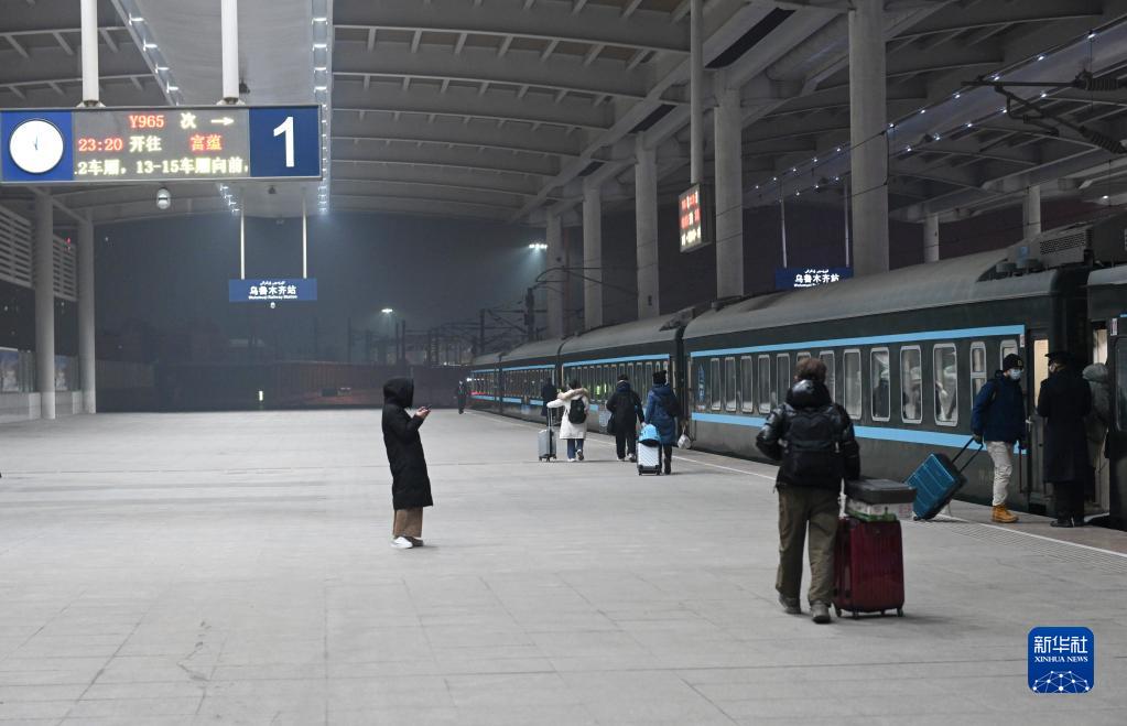 12月28日,旅客在烏魯木齊站登上Y965次“中國雪都·阿勒泰號”冰雪游旅客列車(chē)。