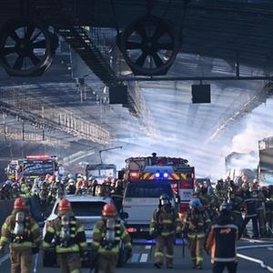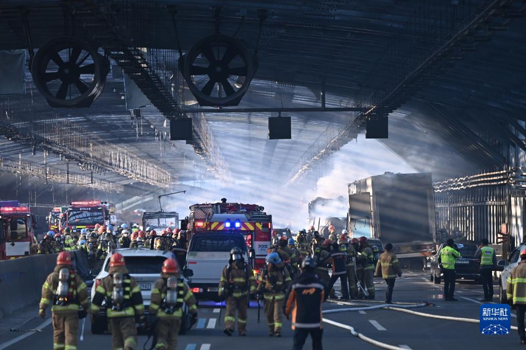 12月29日,消防人員在韓國京畿道果川第二京仁高速公路發(fā)生火災的隔音隧道內工作。
