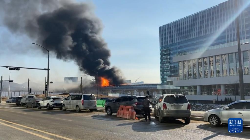 12月29日,韓國京畿道果川第二京仁高速公路事故現場(chǎng)升起大量濃煙。