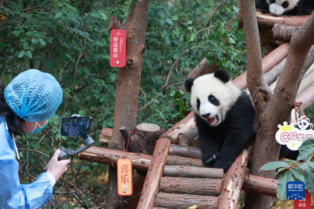12月29日,成都大熊貓繁育研究基地工作人員在新年活動(dòng)上為大熊貓寶寶拍照。