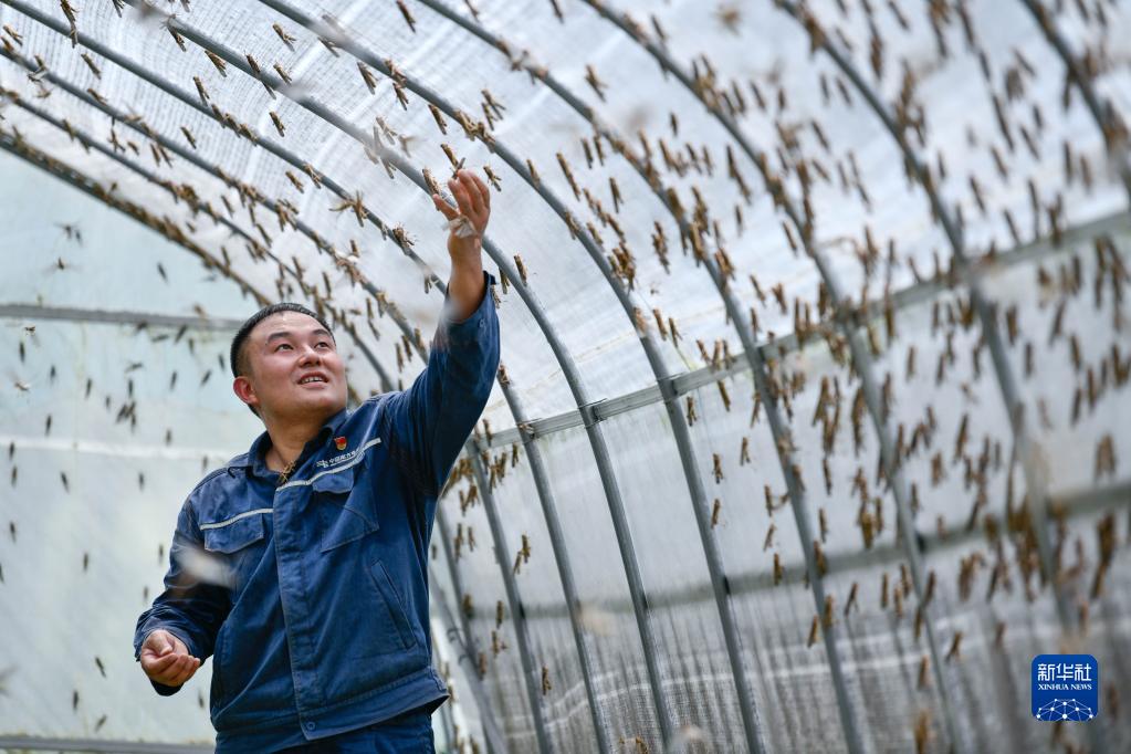 劉開(kāi)福在村里查看大棚養殖的螞蚱生長(cháng)情況(2022年8月3日攝)。