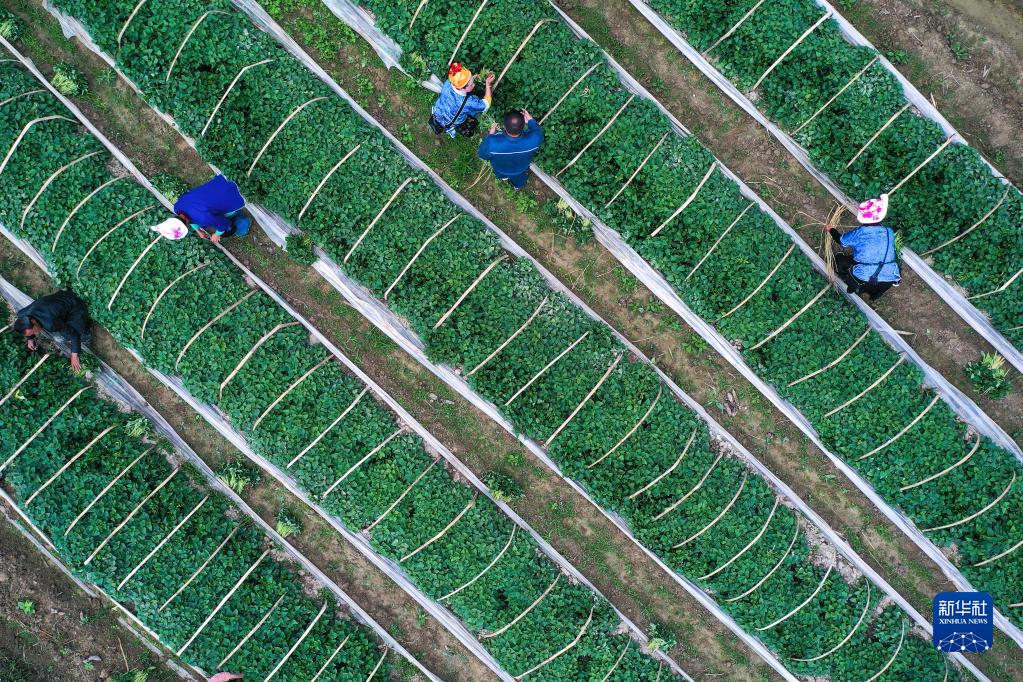 劉開(kāi)福與村民在田間移栽紫薯苗(2022年5月10日攝,無(wú)人機照片)。