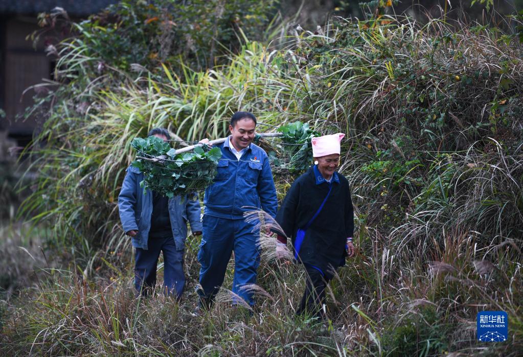 劉開(kāi)福(中)與村民移栽油菜苗途中(2022年11月14日攝)。