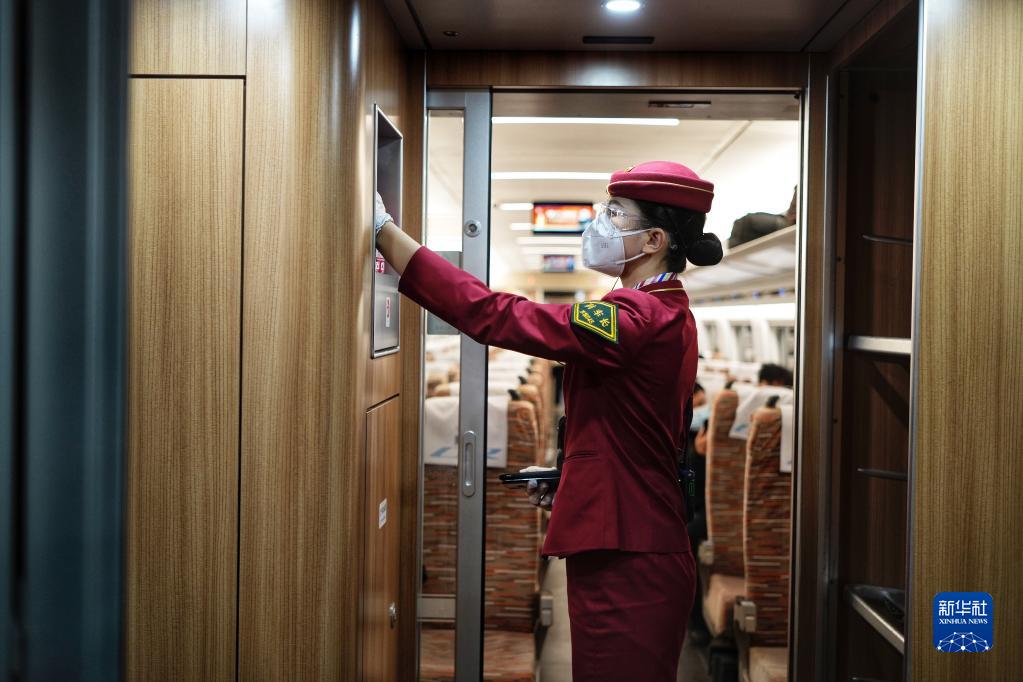12月30日,由唐山開(kāi)往北京的G8802次列車(chē)乘務(wù)員在列車(chē)上工作。