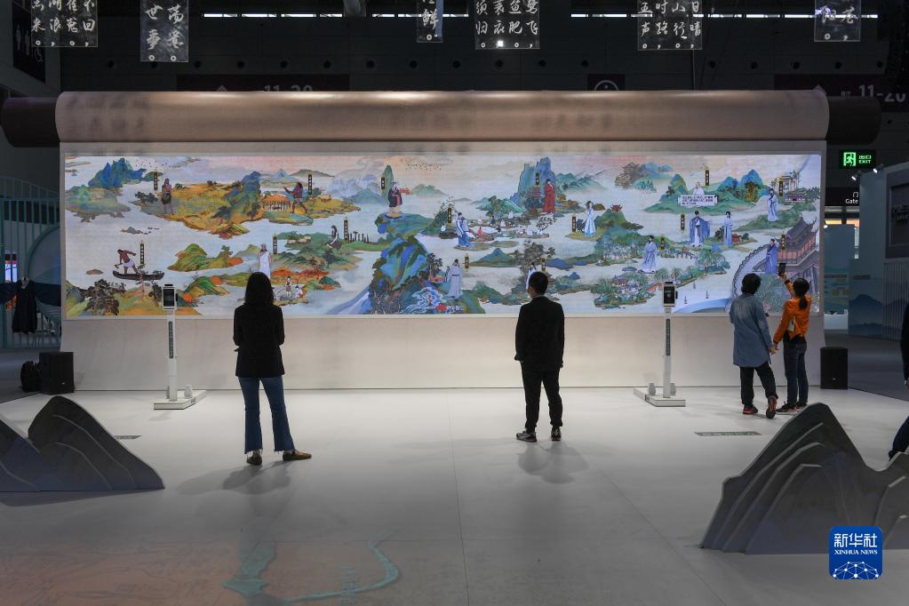 12月29日,參觀(guān)者在第十八屆文博會(huì )浙江展臺體驗新華智云自主研發(fā)的數字文化互動(dòng)長(cháng)卷。