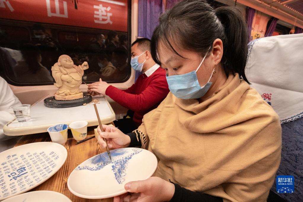 12月30日,在T8010次列車(chē)上,福建省泉州市德化縣的陶瓷手繪藝人向旅客展示陶瓷繪畫(huà)技藝。