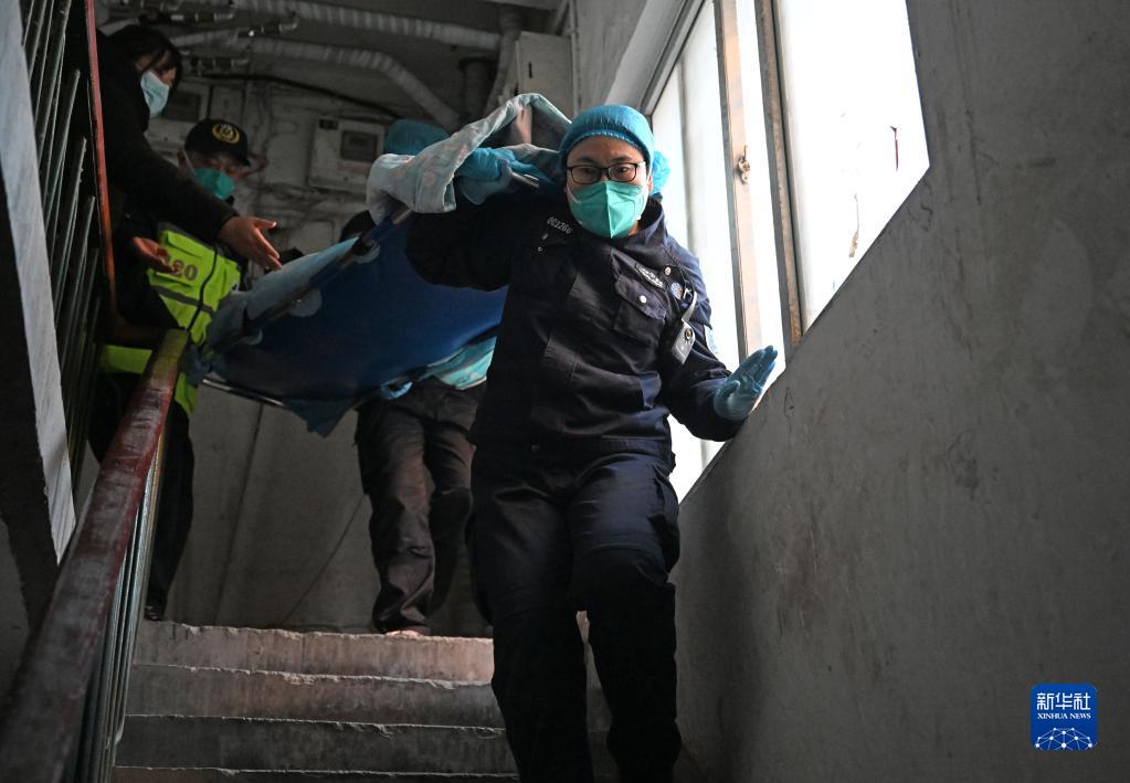 急救醫生謝艷杰(前)和同事一起抬運擔架(12月29日攝)。新華社記者 趙子碩 攝