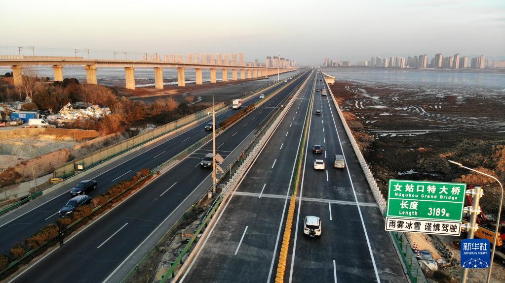 這是12月30日拍攝的建成通車(chē)的青蘭高速公路改擴建工程女姑口跨海特大橋(無(wú)人機照片)。新華社記者 李紫恒 攝