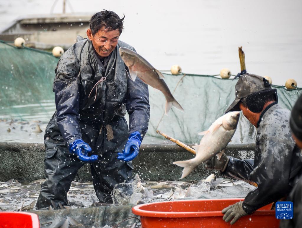 12月30日,江蘇淮安市淮安區流均鎮養殖戶(hù)在魚(yú)塘冬捕。新華社發(fā)(趙啟瑞 攝)