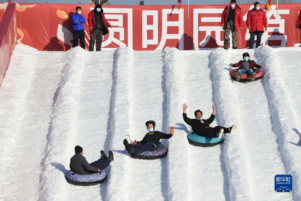 12月31日,游客在圓明園雪場(chǎng)滑雪圈。