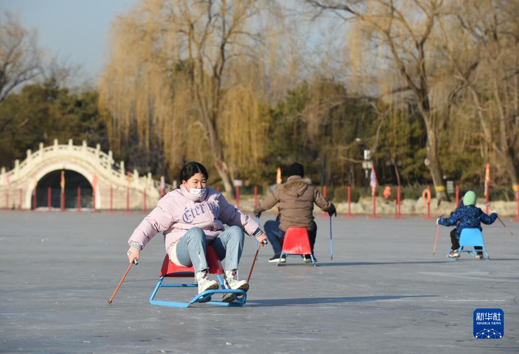 12月31日,游客在圓明園冰場(chǎng)滑冰車(chē)。