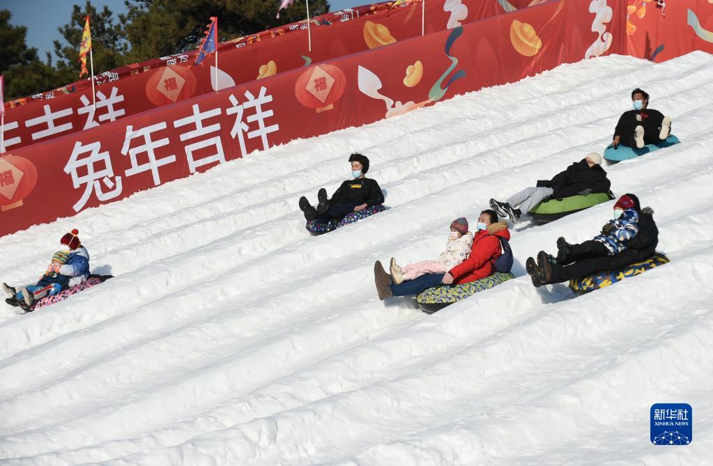 12月31日,游客在圓明園雪場(chǎng)滑雪圈。