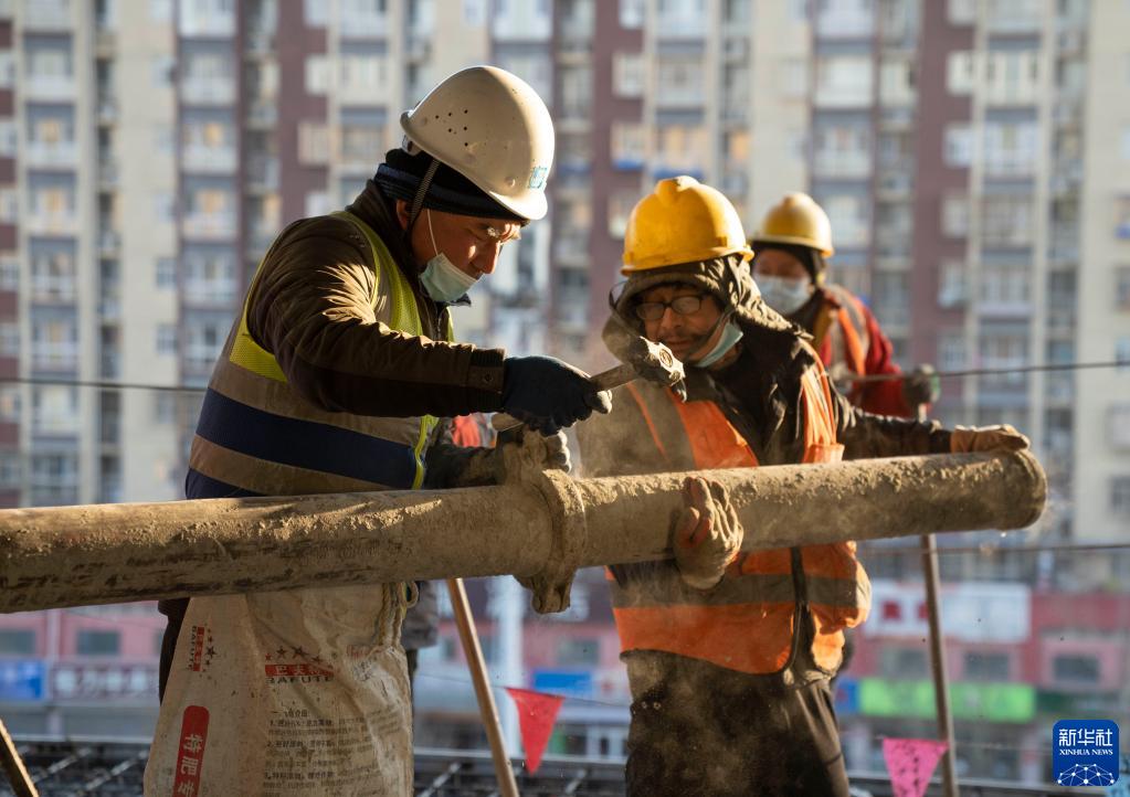 12月31日,在北京市豐臺區檔案館建設項目工地,工人們在安裝混凝土泵管。