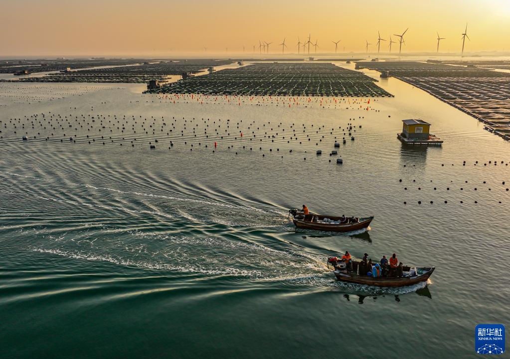 12月31日,在山東省榮成市石島管理區桑溝灣海洋牧場(chǎng),漁民們駕駛漁船前往網(wǎng)箱養殖區進(jìn)行作業(yè)(無(wú)人機照片)。