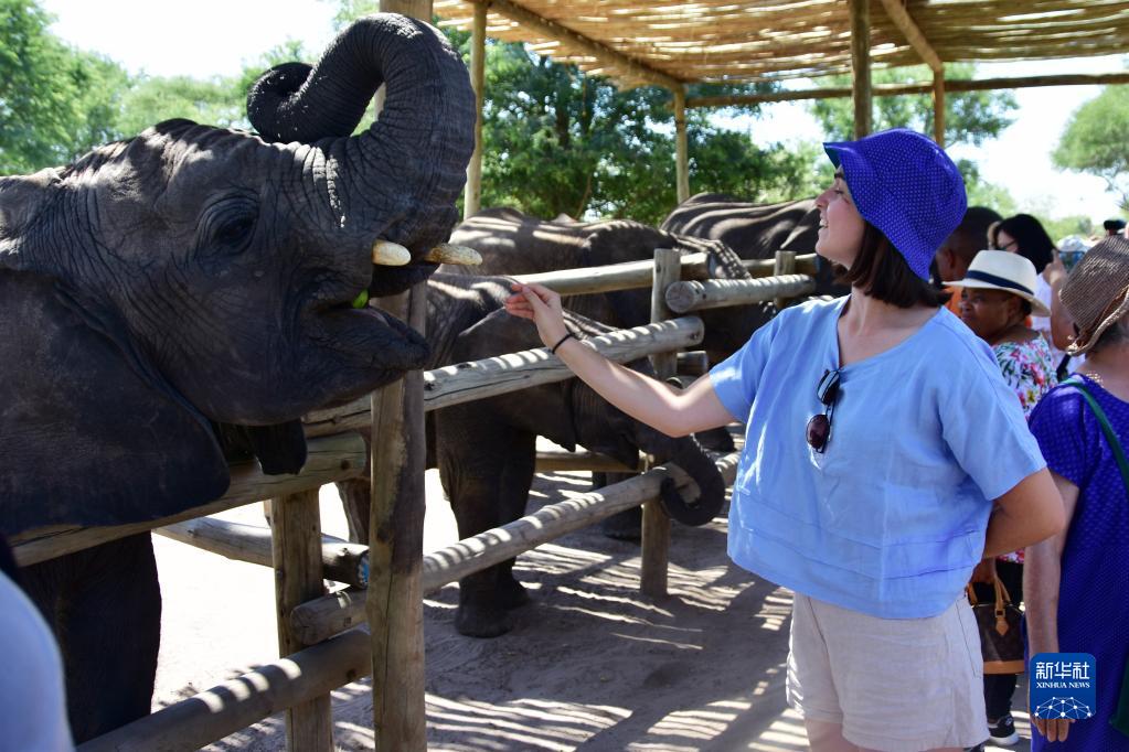12月26日,在博茨瓦納東北部馬翁的大象孤兒院,游客投喂幼象。