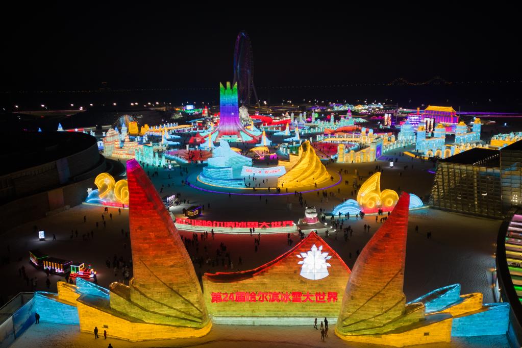 12月31日,游客在哈爾濱冰雪大世界園區游覽(無(wú)人機照片)。