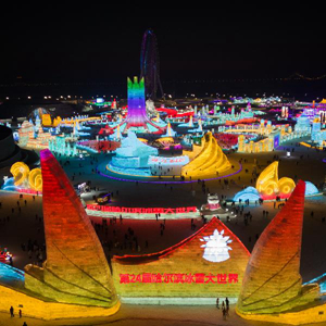 當日,許多市民和游客來(lái)到哈爾濱冰雪大世界園區游玩,迎接新年到來(lái)。