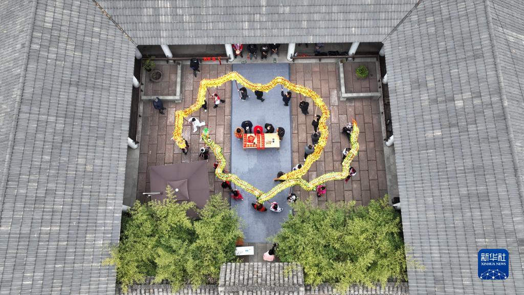 1月1日,在浙江省湖州市德清縣阜溪街道興山社區居家養老服務(wù)中心,少數民族群眾在舞龍(無(wú)人機照片)。