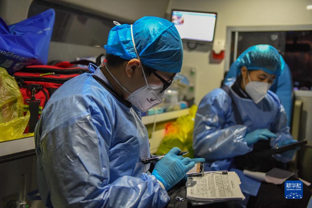 2022年12月31日,接到患者后,長(cháng)春市急救中心富民大街急救站護士吳炳國(左)在救護車(chē)上登記患者信息。