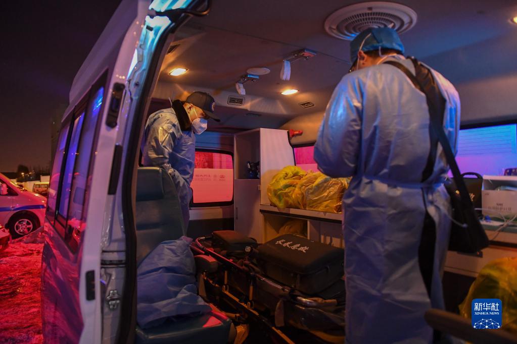 2022年12月31日,長(cháng)春市急救中心富民大街急救站擔架員徐文超(左)、護士吳炳國整理裝備準備出車(chē)。