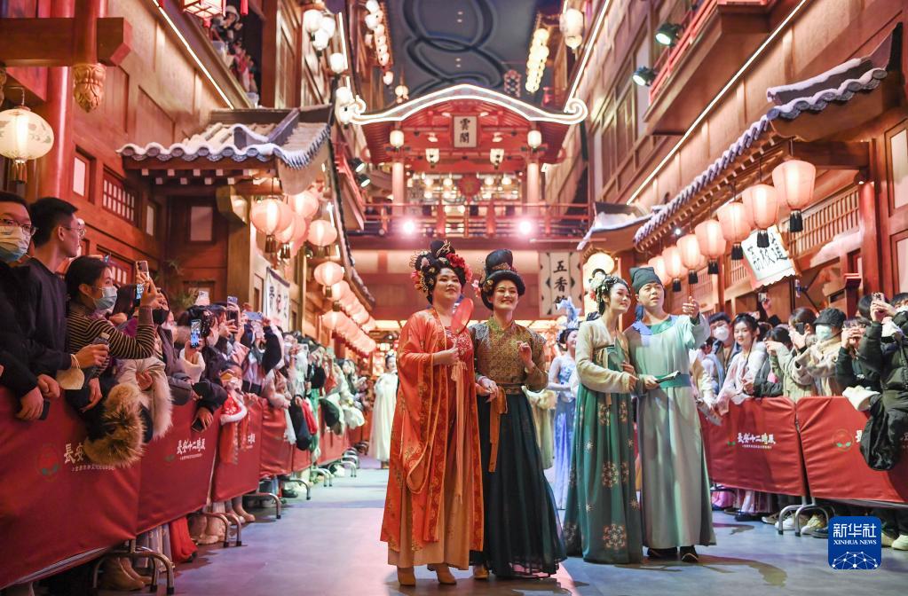 2022年12月31日,游客在長(cháng)安十二時(shí)辰主題街區觀(guān)看表演。
