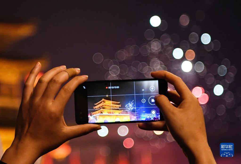 2022年12月31日,游客在鐘樓前拍攝跨年煙花表演。