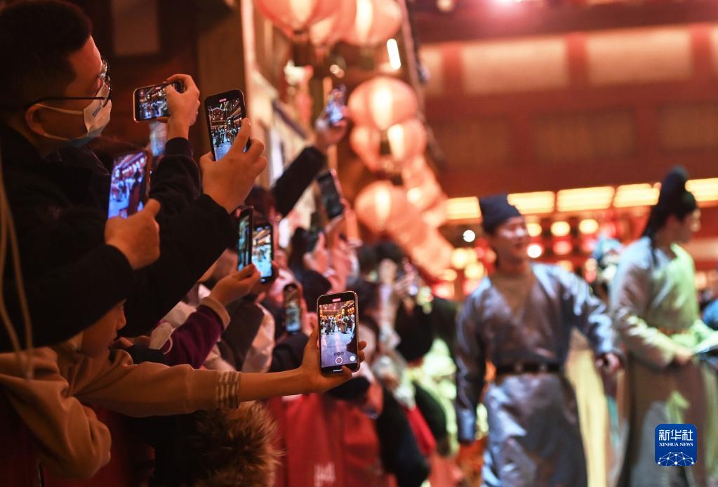 2022年12月31日,游客在長(cháng)安十二時(shí)辰主題街區觀(guān)看表演。