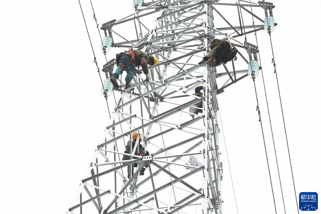 1月1日,工人在貴州省銅仁市松桃苗族自治縣盤(pán)石鎮光伏發(fā)電場(chǎng)進(jìn)行鐵塔自檢。