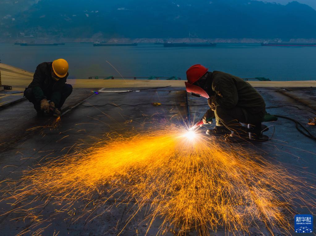 1月1日,湖北省宜昌市秭歸縣秭歸華星船務(wù)有限公司工人在船舶建造現場(chǎng)忙碌。