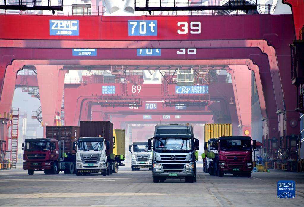 1月1日,青島港前灣QQCT集裝箱碼頭,貨車(chē)在運送集裝箱。