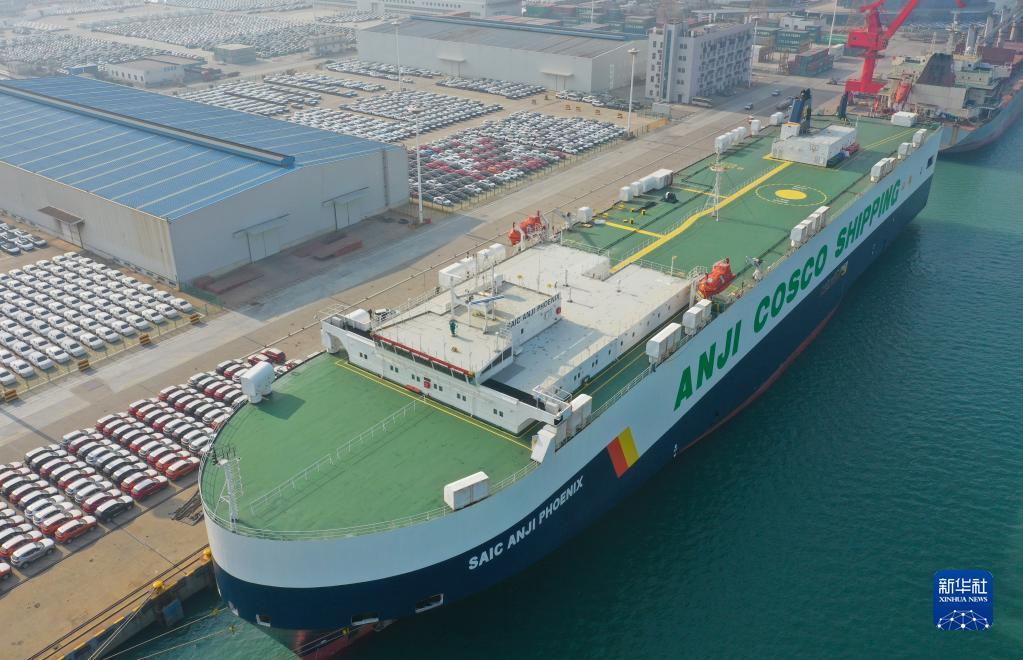 1月1日,大型汽車(chē)滾裝船“安吉鳳凰號”在江蘇連云港港汽車(chē)出口碼頭裝運車(chē)輛(無(wú)人機照片)。