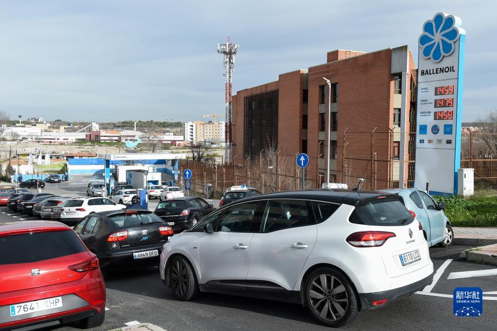2022年12月31日,在西班牙馬德里,汽車(chē)排隊駛入一處加油站加油。