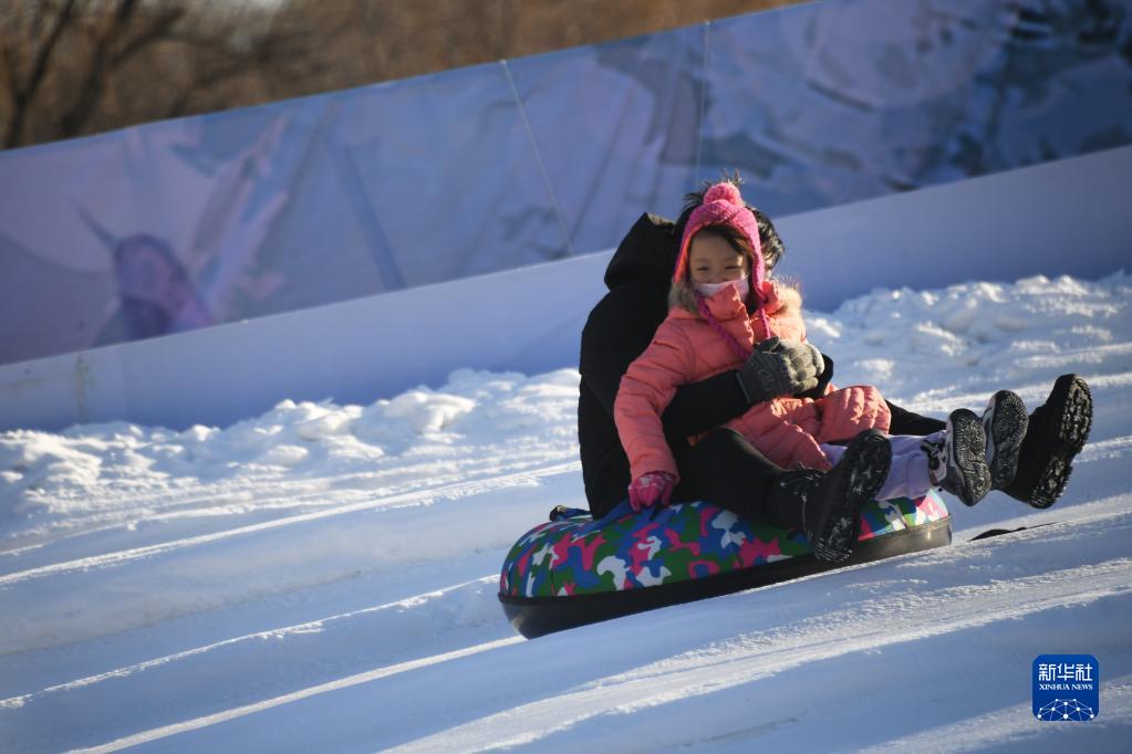 1月2日,一名小朋友和家長(cháng)在北京玉淵潭公園體驗“雪上飛碟”。