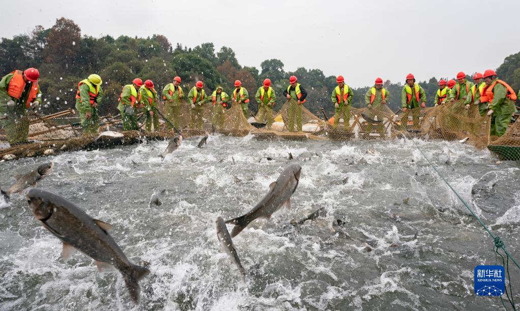 當日,漁民在江西省新余市仙女湖進(jìn)行新年冬捕作業(yè)。仙女湖漁業(yè)資源豐富,盛產(chǎn)胖頭魚(yú)、鯉魚(yú)、青魚(yú)、鰱魚(yú)等魚(yú)類(lèi)。