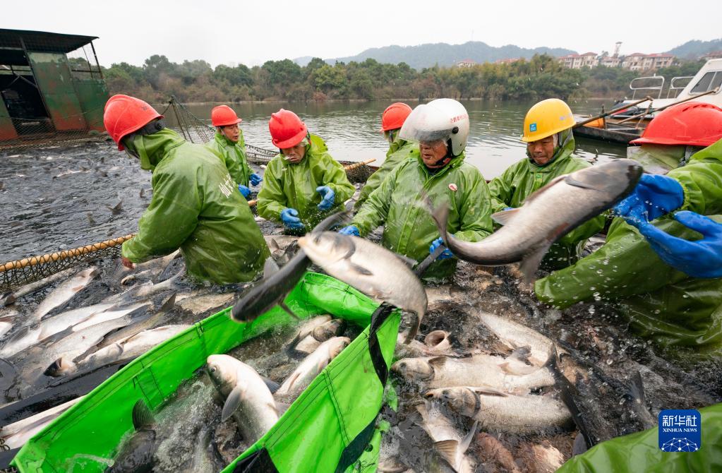 當日,漁民在江西省新余市仙女湖進(jìn)行新年冬捕作業(yè)。仙女湖漁業(yè)資源豐富,盛產(chǎn)胖頭魚(yú)、鯉魚(yú)、青魚(yú)、鰱魚(yú)等魚(yú)類(lèi)。