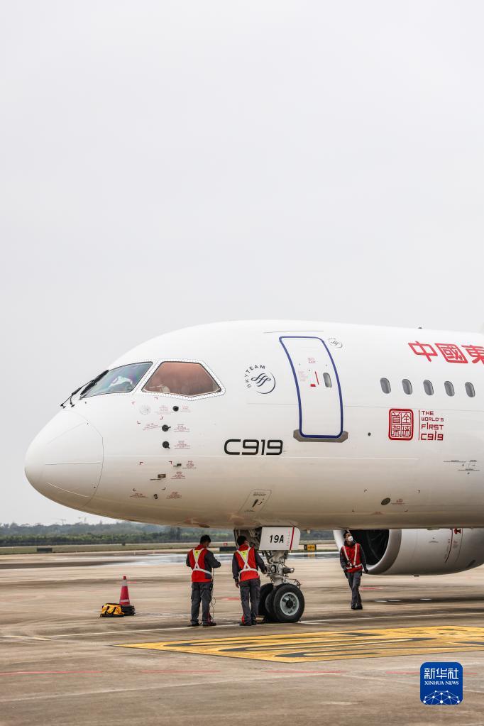 新華全媒+丨國產(chǎn)大飛機C919飛抵??诿捞m國際機場(chǎng)