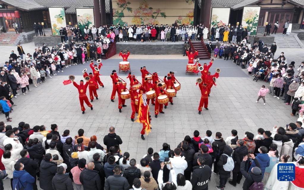 2023年1月2日,游客在開(kāi)封市清明上河園里觀(guān)看表演(無(wú)人機照片)。