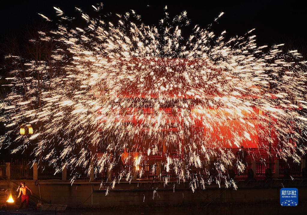 2022年12月31日,工作人員在位于鄭州市中牟縣的電影小鎮里表演打鐵花。