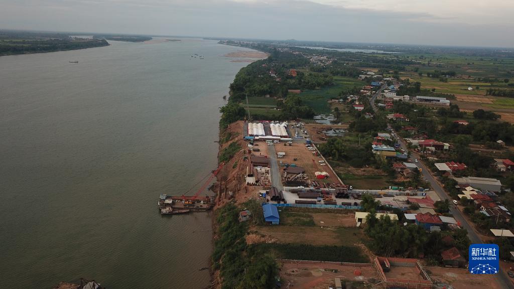 這是1月1日在柬埔寨桔井市拍攝的中企承建大橋工地(無(wú)人機照片)。