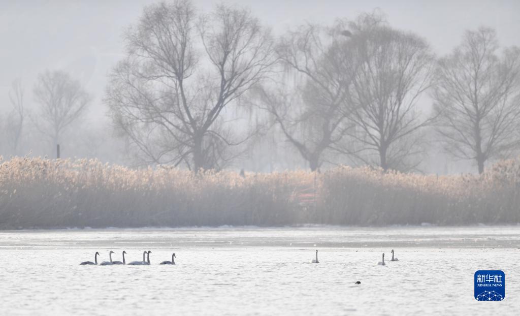 1月2日,大天鵝在三河口天鵝灘濕地的水面上游弋。