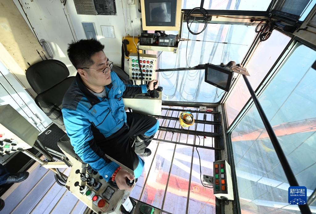 1月1日,岸橋司機在天津港聯(lián)盟國際集裝箱碼頭進(jìn)行裝卸作業(yè)。