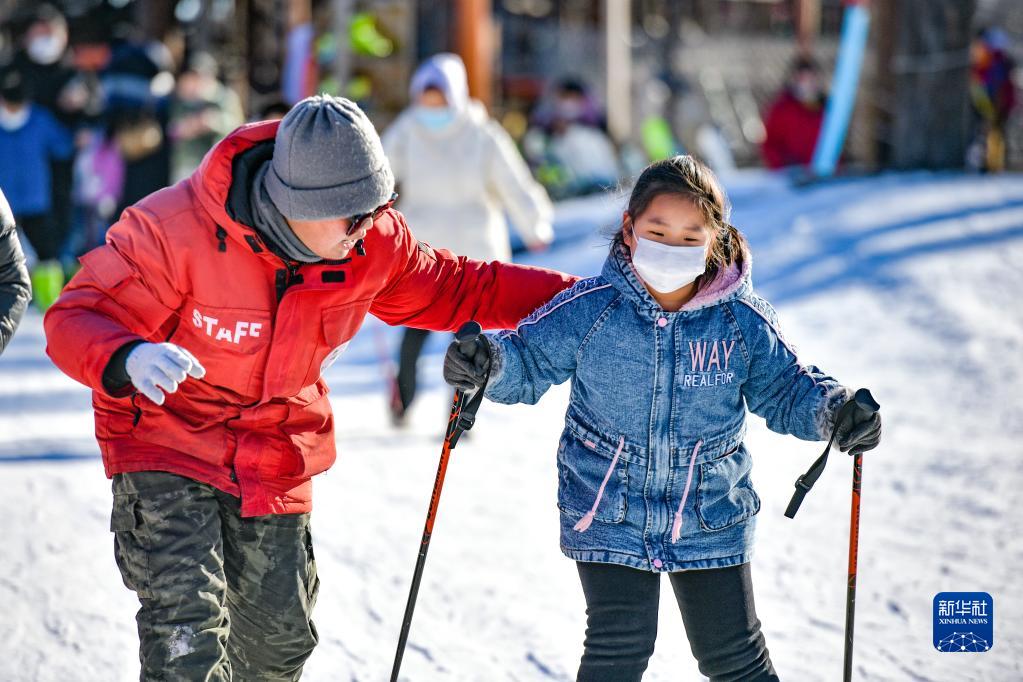 1月2日,在天津市薊州區一主題樂(lè )園,小朋友在教練的陪同下體驗初級滑雪。
