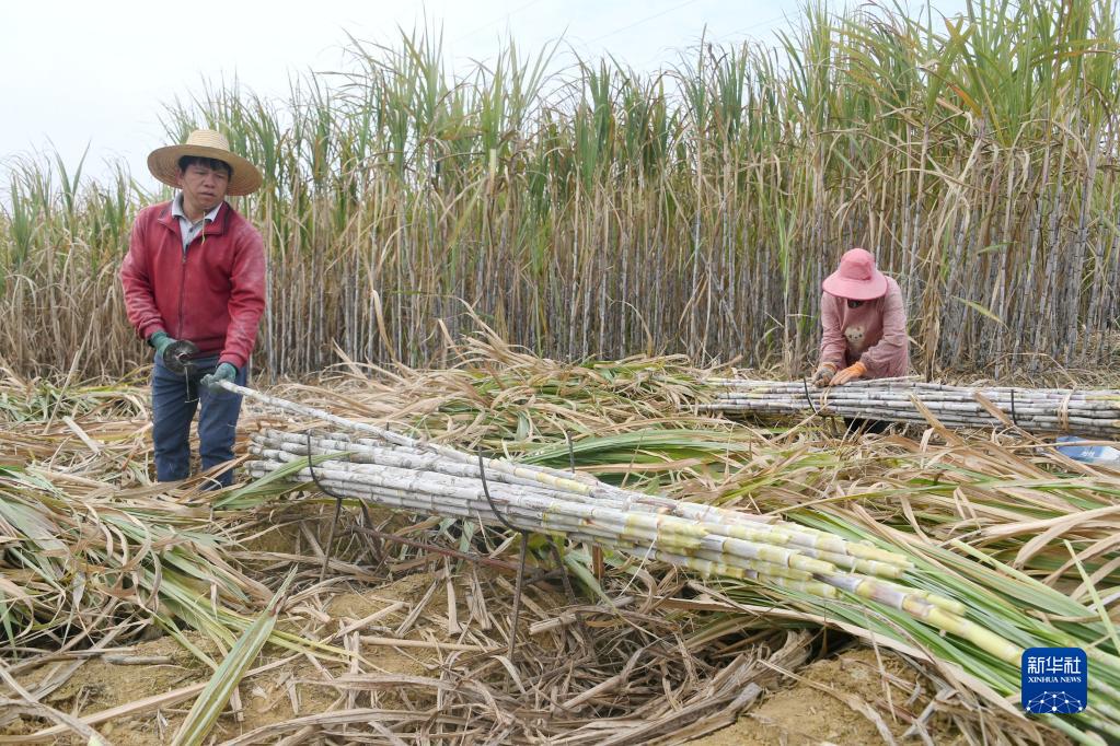 1月2日,在廣西河池市羅城仫佬族自治縣小長(cháng)安鎮守善村,農民在甘蔗地里砍收甘蔗。