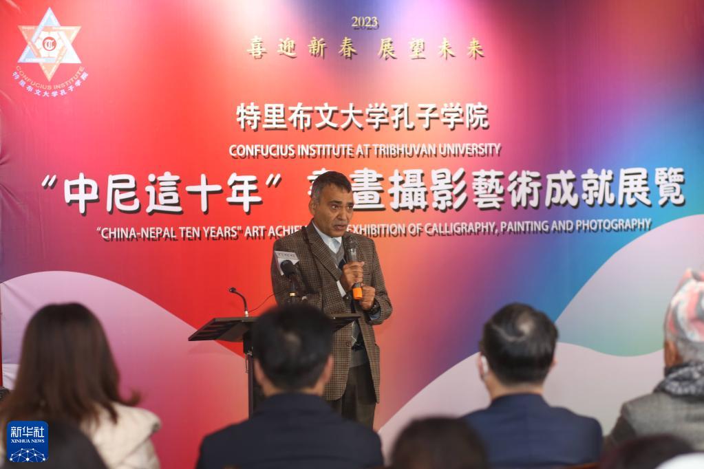 1月3日,在尼泊爾首都加德滿(mǎn)都,特里布文大學(xué)孔子學(xué)院尼方院長(cháng)巴爾穆昆達·雷格米在“中尼這十年”書(shū)畫(huà)攝影藝術(shù)成就展開(kāi)幕式上講話(huà)。