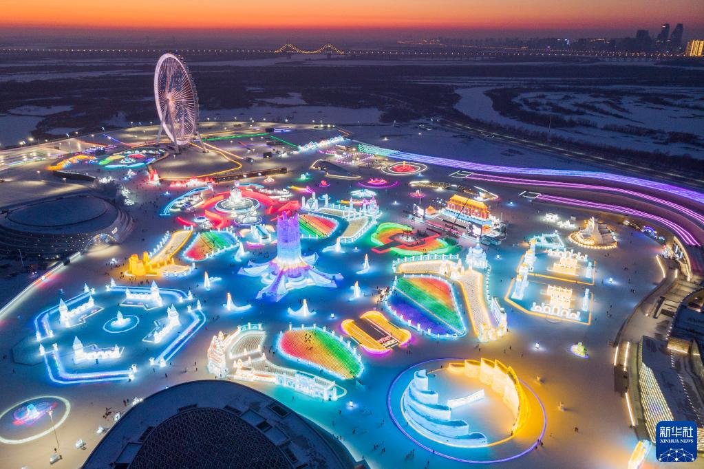 這是1月3日拍攝的夕陽(yáng)下的第24屆哈爾濱冰雪大世界園區(無(wú)人機照片)。