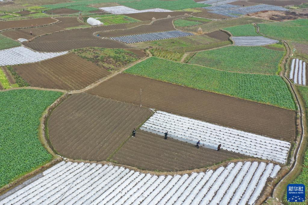 1月3日,在湖南省湘西土家族苗族自治州吉首市乾州街道西門(mén)口村,村民在田間給種植的馬鈴薯覆蓋地膜(無(wú)人機照片)。
