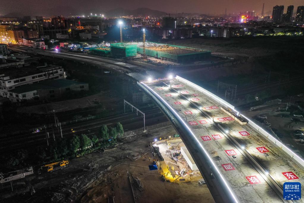 這是轉體成功后的轉體梁上跨廣深鐵路(1月4日攝,無(wú)人機照片)。