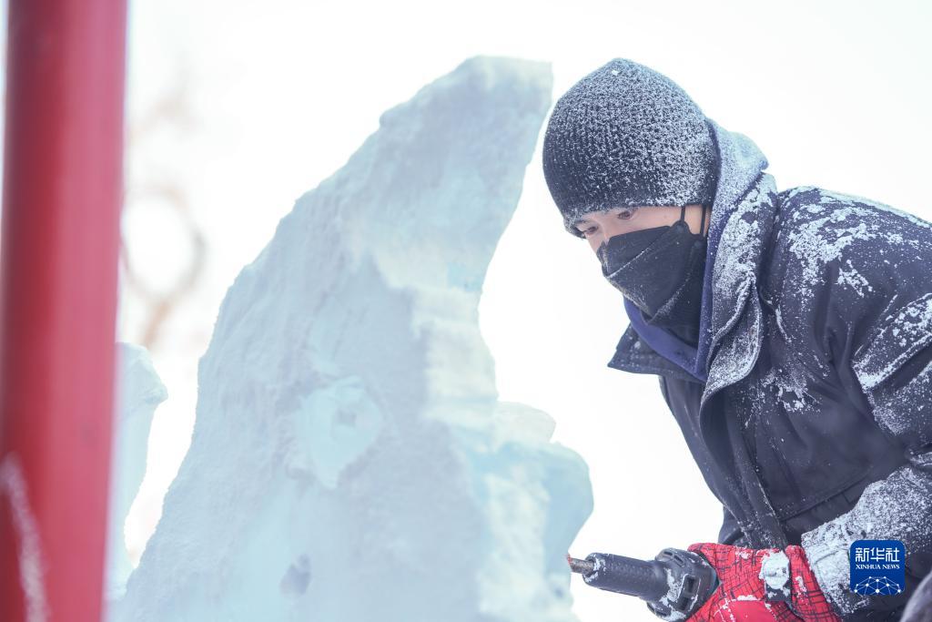 1月4日,在哈爾濱冰燈藝術(shù)游園會(huì )園區,冰雕師在進(jìn)行冰雕藝術(shù)作品創(chuàng )作。
