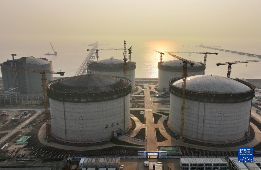 1月4日拍攝的唐山市曹妃甸區新天LNG(液化天然氣)項目接收站工程建設工地(無(wú)人機照片)。